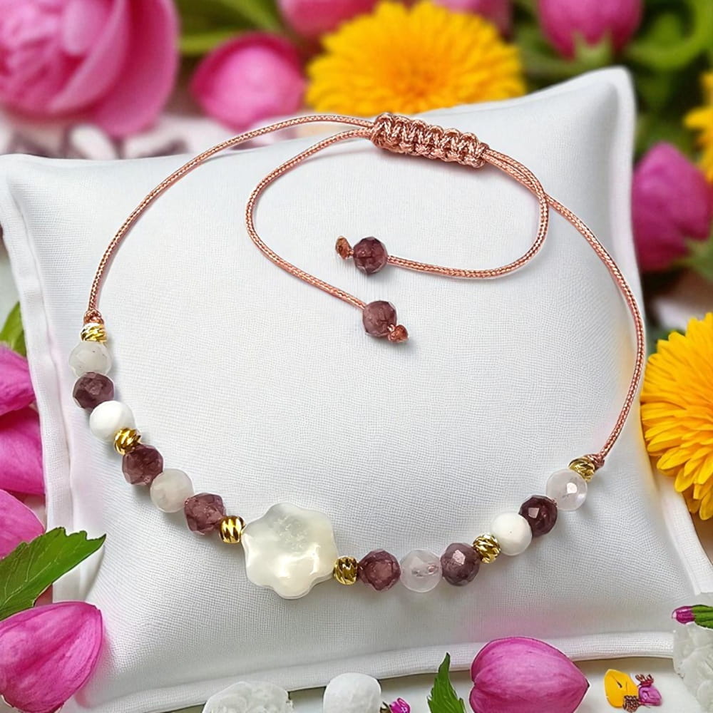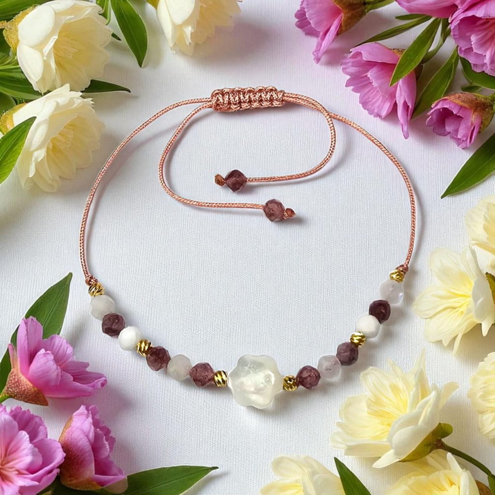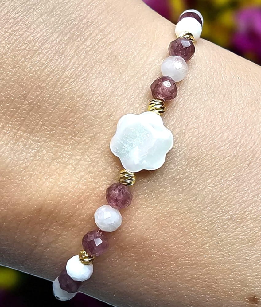 Bransoletka Amulet „Energia Spokoju” to subtelny amulet stworzony dla tych, którzy pragną równowagi emocjonalnej, wewnętrznego ukojenia i głębokiej więzi z intuicją. Połączenie naturalnego lepidolitu, kamienia księżycowego i muszli tworzy energetyczne wsparcie dla dusz wysoko wrażliwych, zestresowanych lub żyjących w nadmiarze bodźców. Lepidolit pomaga wyciszyć umysł, łagodzi napięcia i wspiera spokojny sen. Kamień księżycowy harmonizuje emocje, aktywuje intuicję i kobiecą cykliczność. Kwiat z muszli symbolizuje delikatną siłę, łagodność i miłość własną. To bransoletka, która otula, nie tylko nadgarstek, ale całe Twoje pole energetyczne. Ręcznie wykonana, z możliwością personalizacji koloru sznurka i przekładek.