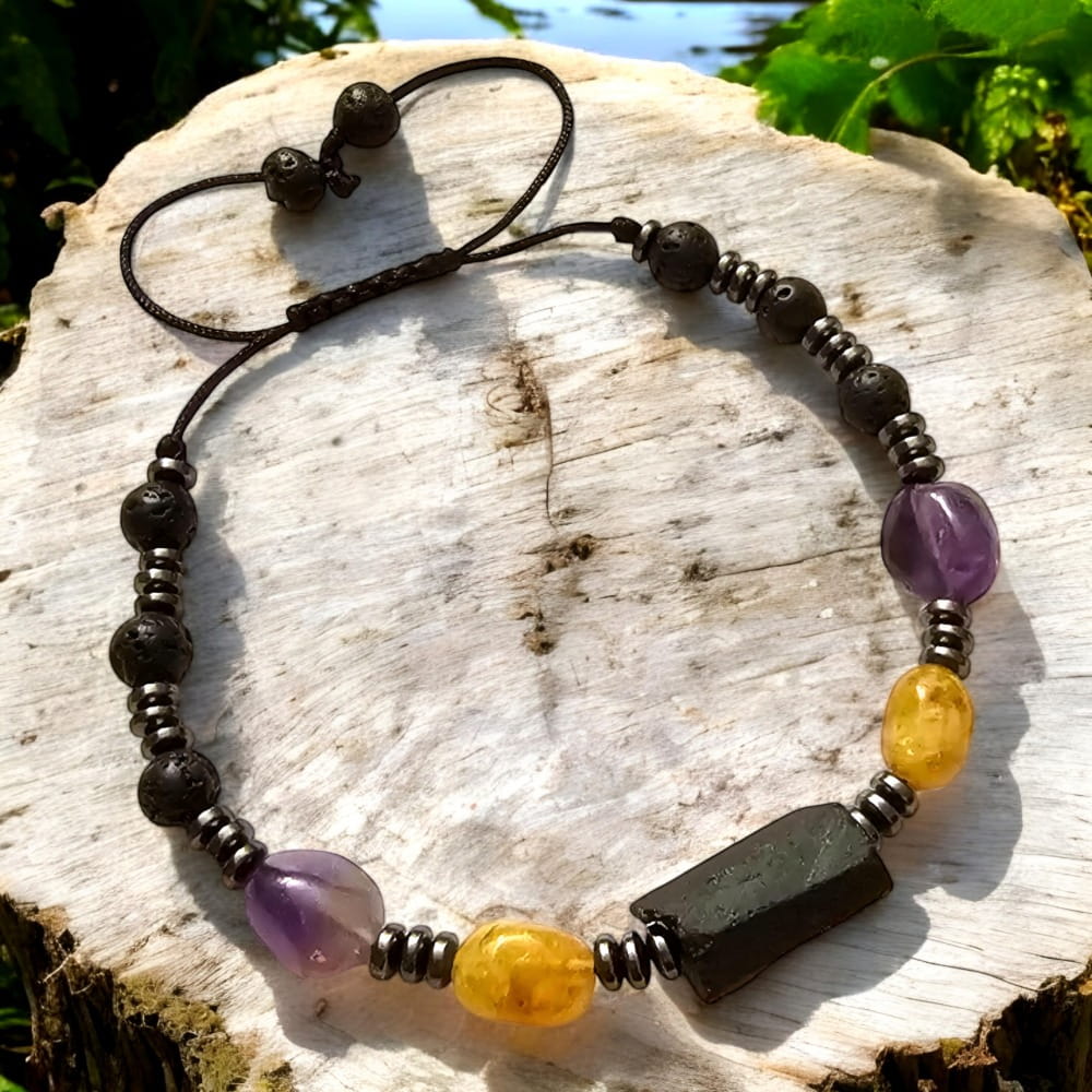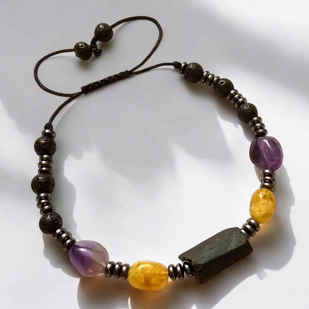 Bransoletka wykonana jest na solidnym, regulowanym sznurku, który pozwala dopasować rozmiar do każdego nadgarstka. Kamienie zostały starannie dobrane, aby stworzyć harmonijną kompozycję kolorów i energii. Czarny, matowy blask lawy i turmalinu kontrastuje z delikatnym połyskiem ametystu i hematytu, a ciepły odcień żółtego turmalinu dodaje całości wyrazistego akcentu.