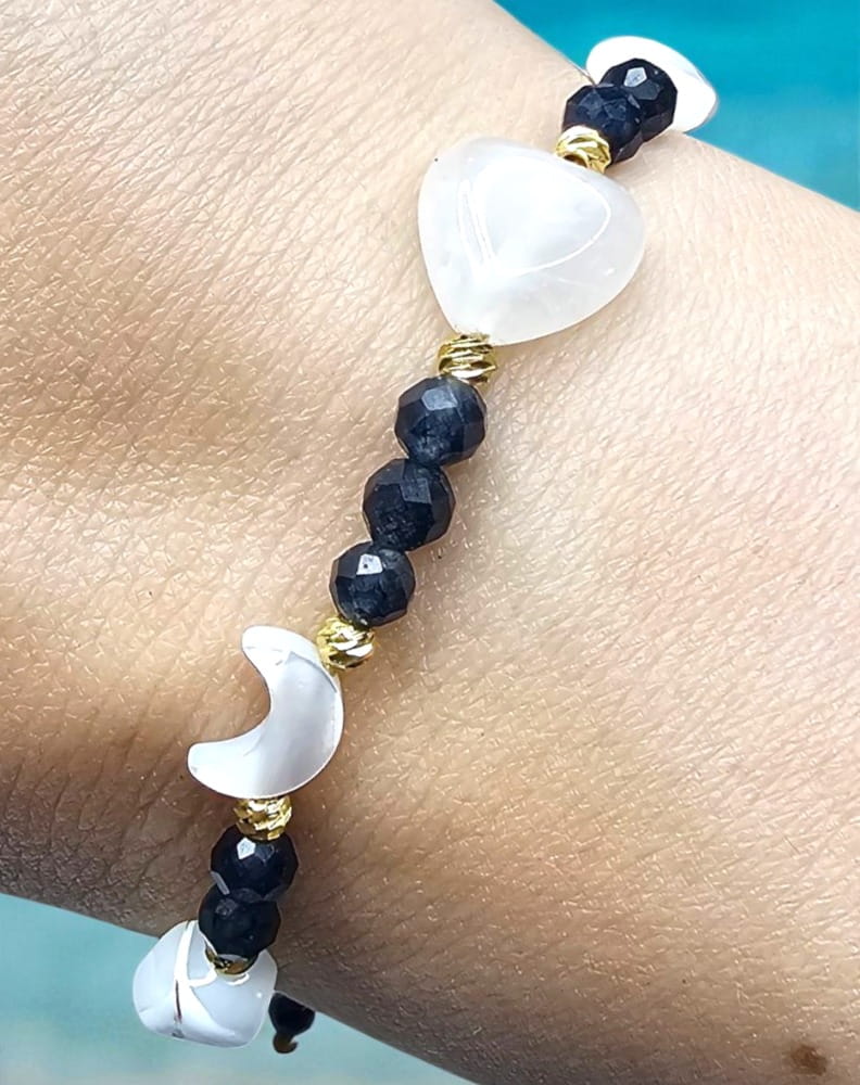 przekładki stal nierdzewna. - Kamienie naturalne: Szafir fasetowany 4mm, serce kwarc górski 10mm, księżyc muszka 10mm, koraliki 6-8mm muszla