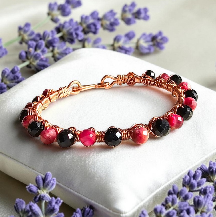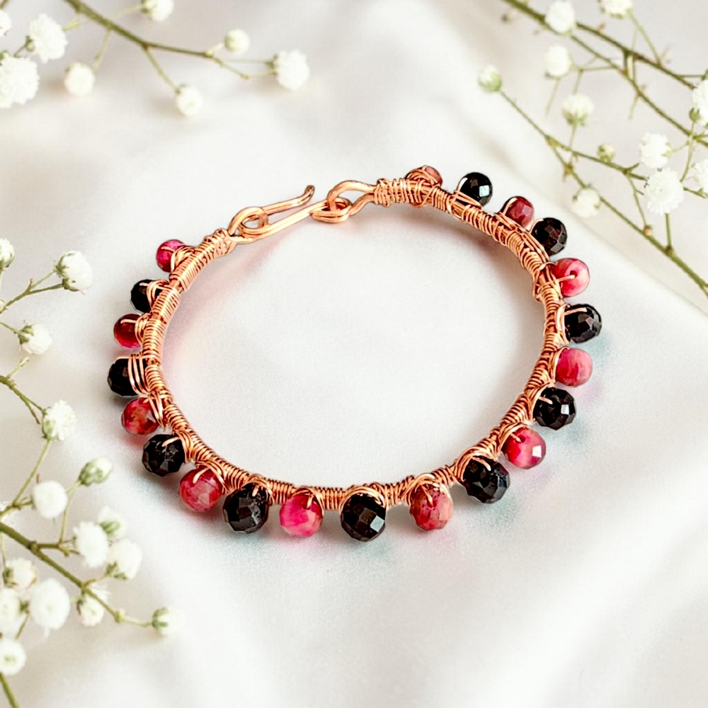 Bransoletka miedziana z czarnym turmalinem i różowym tygrysim okiem