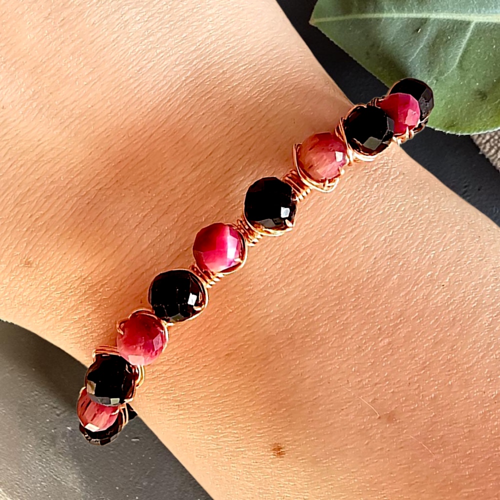 Bransoletka miedziana z czarnym turmalinem i różowym tygrysim okiem na ochronę i pewność siebie