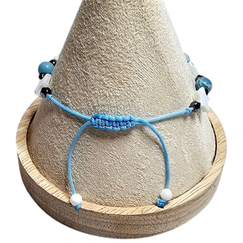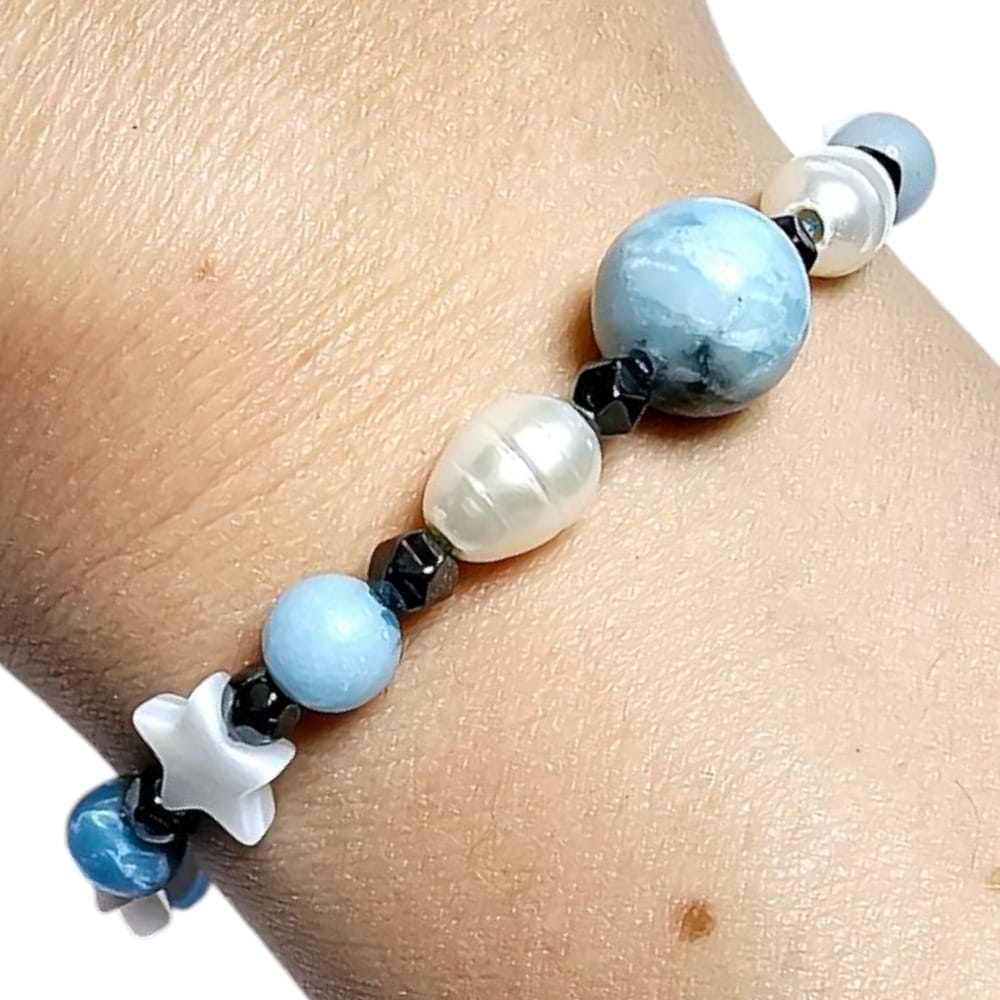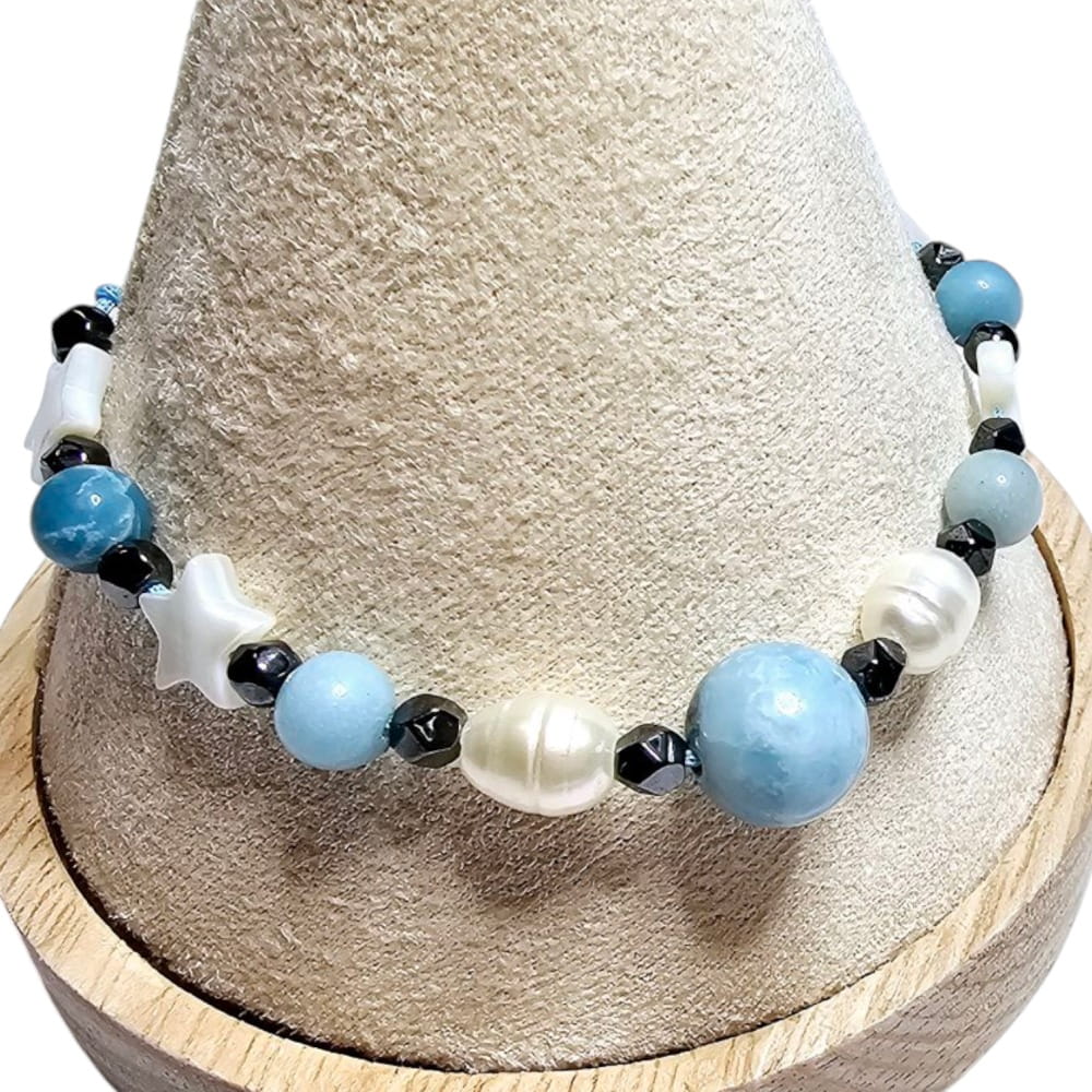 Pozwól sobie na wyjątkowe doświadczenie duchowe i materialne dzięki tej oryginalnej bransoletce. Połączenie Larimaru, Perły i Masy Perłowej stworzyło unikalną biżuterię, która przyciąga bogactwo, wspiera rozwój mądrości oraz przynosi szczęście.