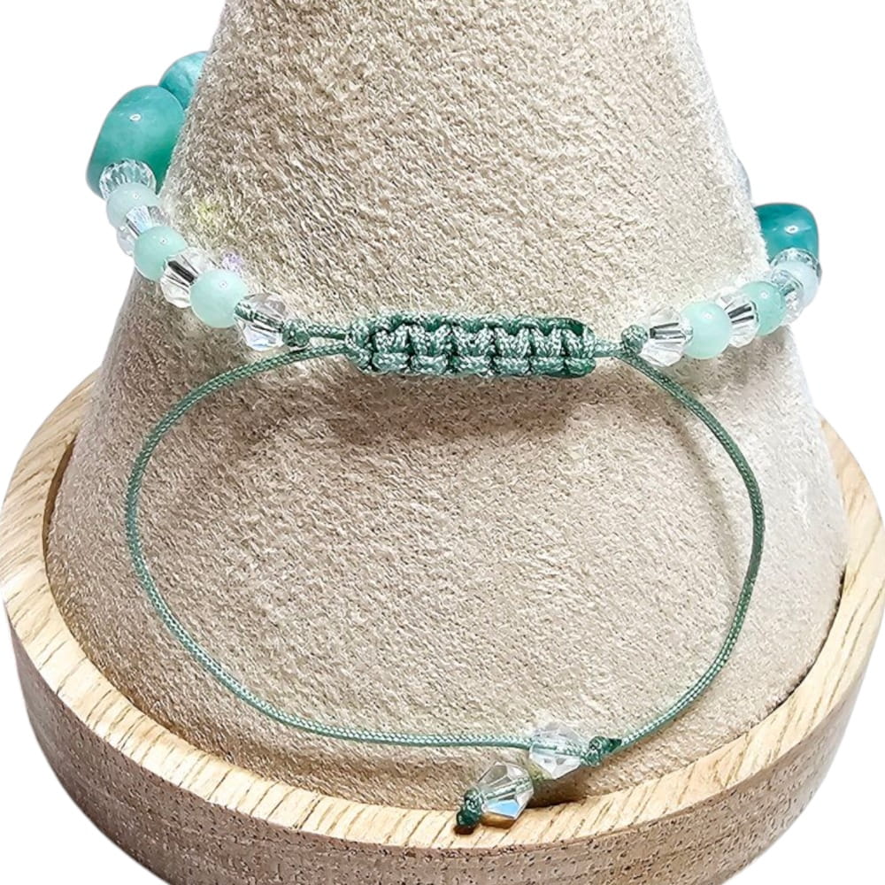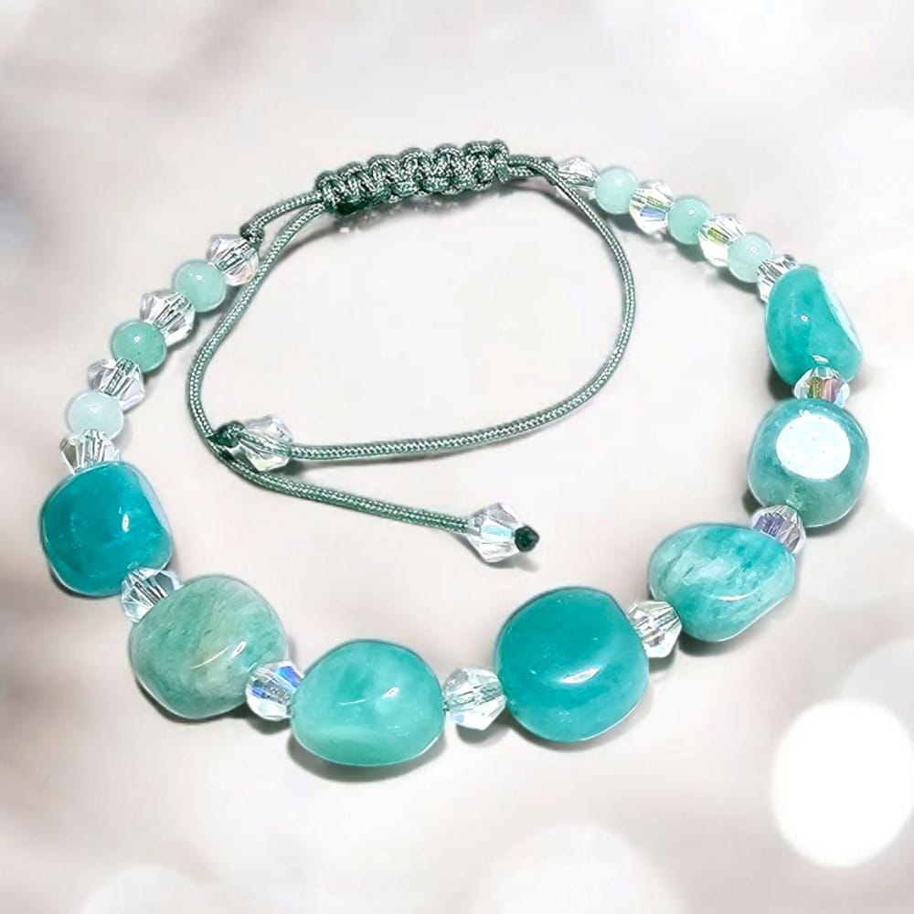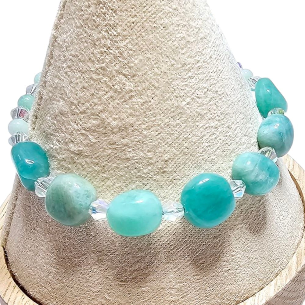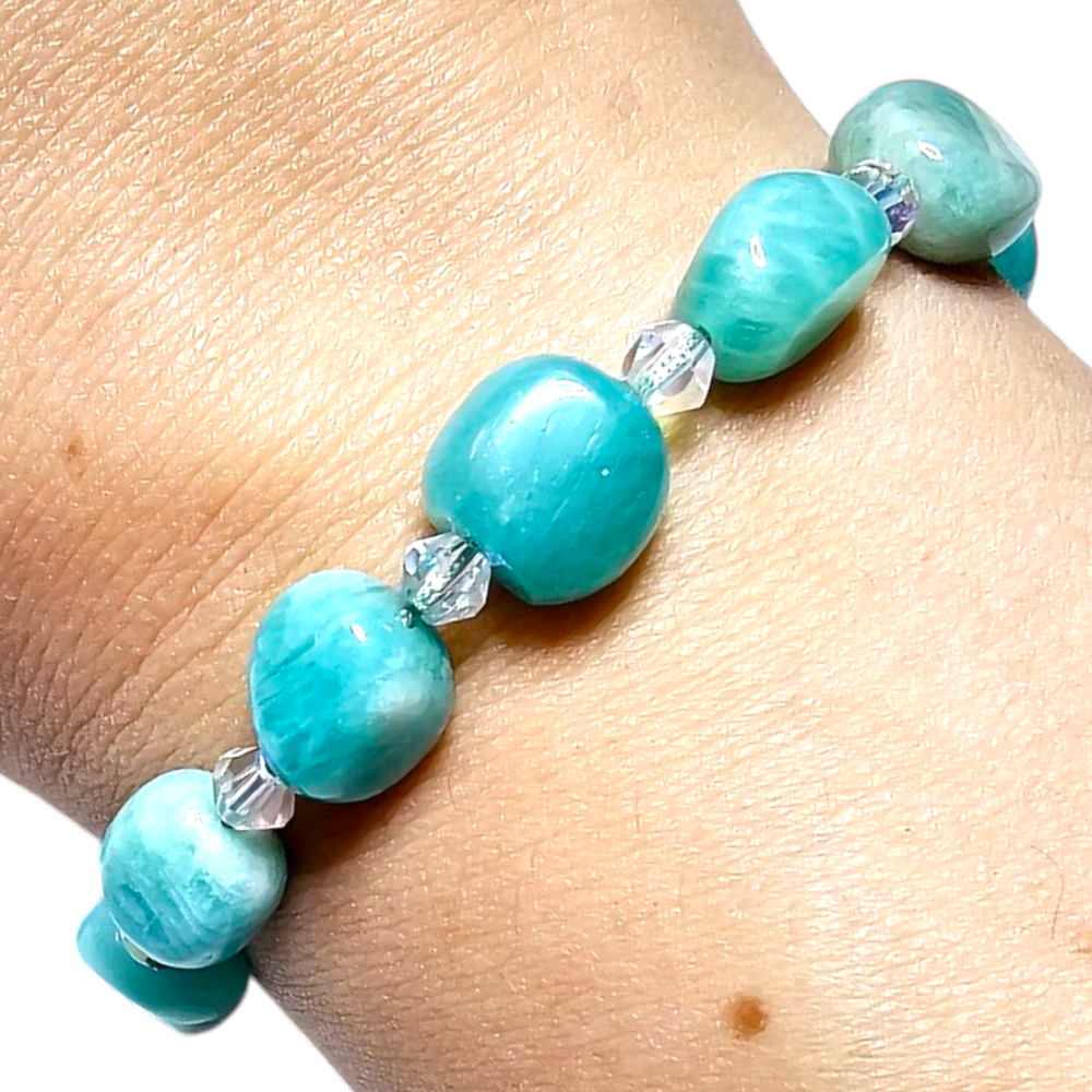 Dodaj do swojej kolekcji bransoletkę, która łączy kojącą energię amazonitu z eleganckim blaskiem szkła kryształowego – idealna na każdą okazję!