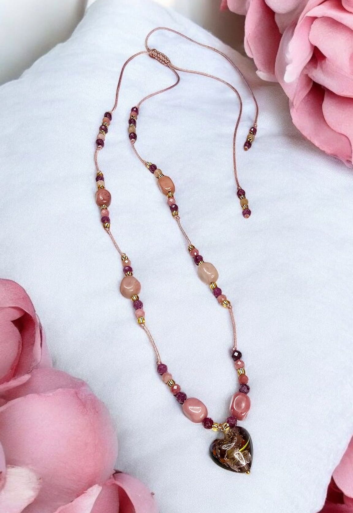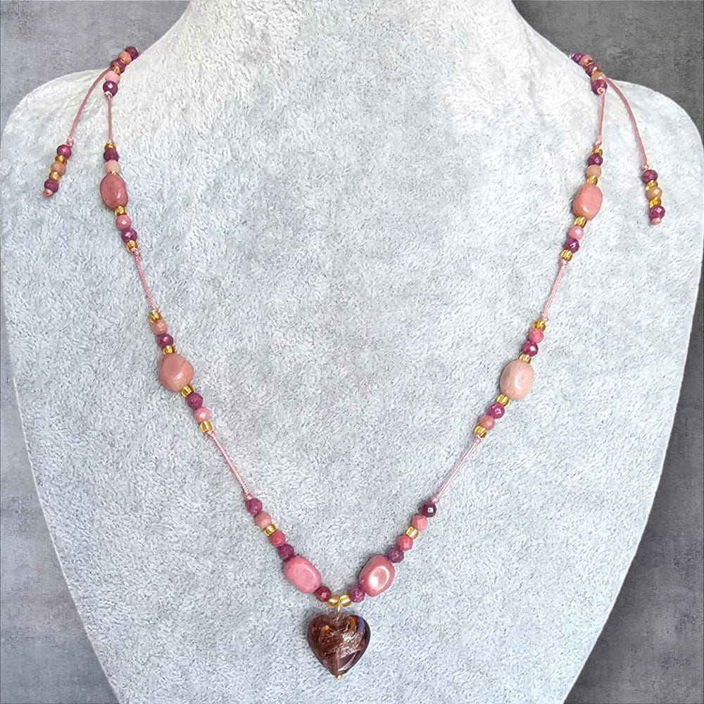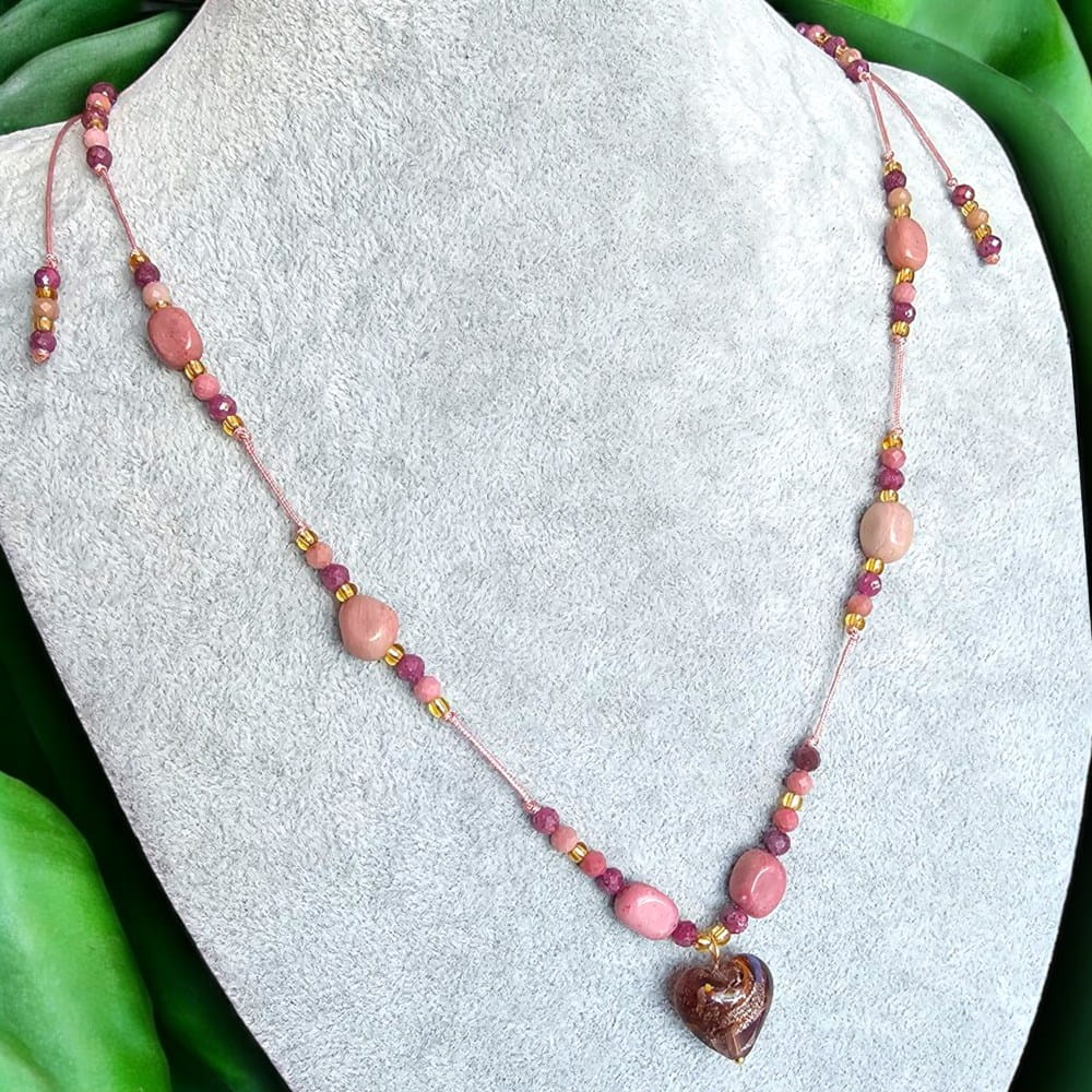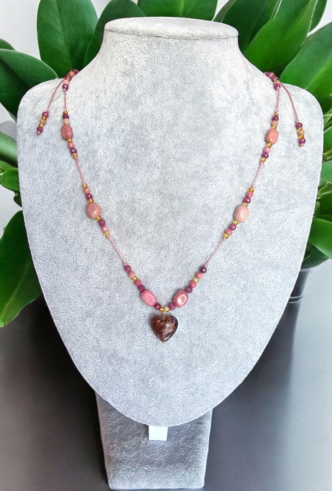 Naszyjnik z Rodonitem i Rubinami z możliwością regulowania długości, z zawieszką w kształcie serca