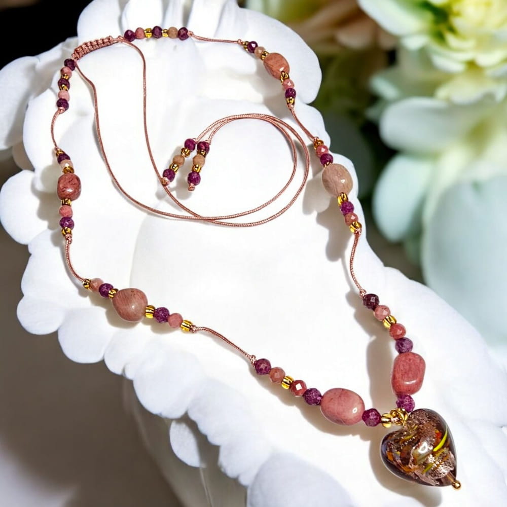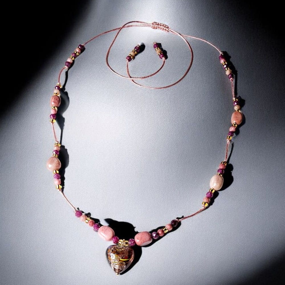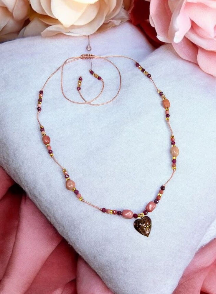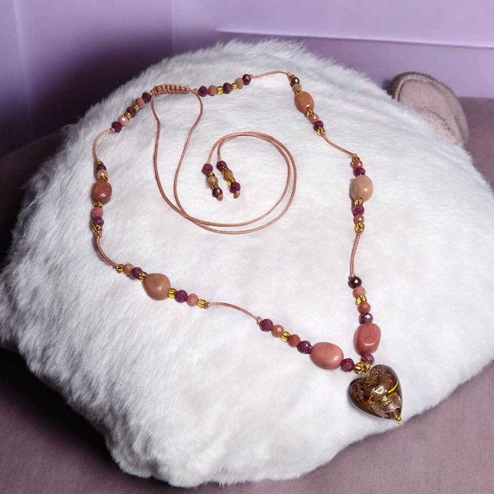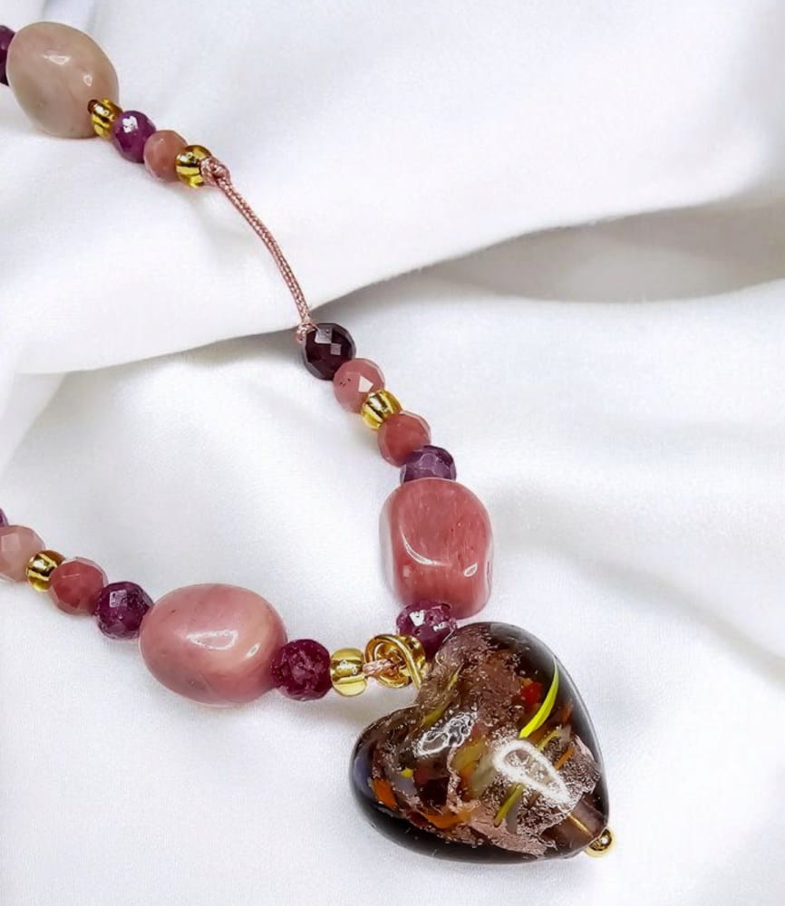 Naszyjnik z Rodonitem i Rubinami z możliwością regulowania długości, z zawieszką w kształcie serca