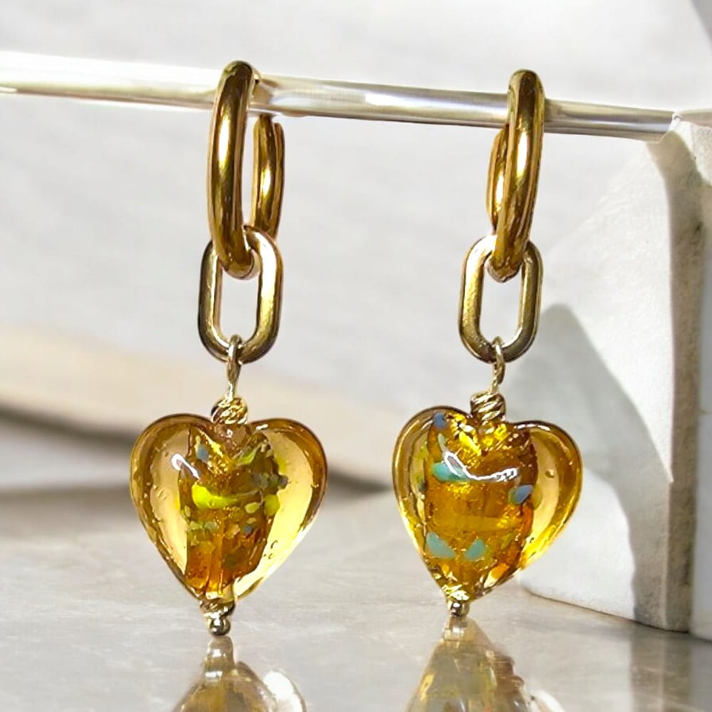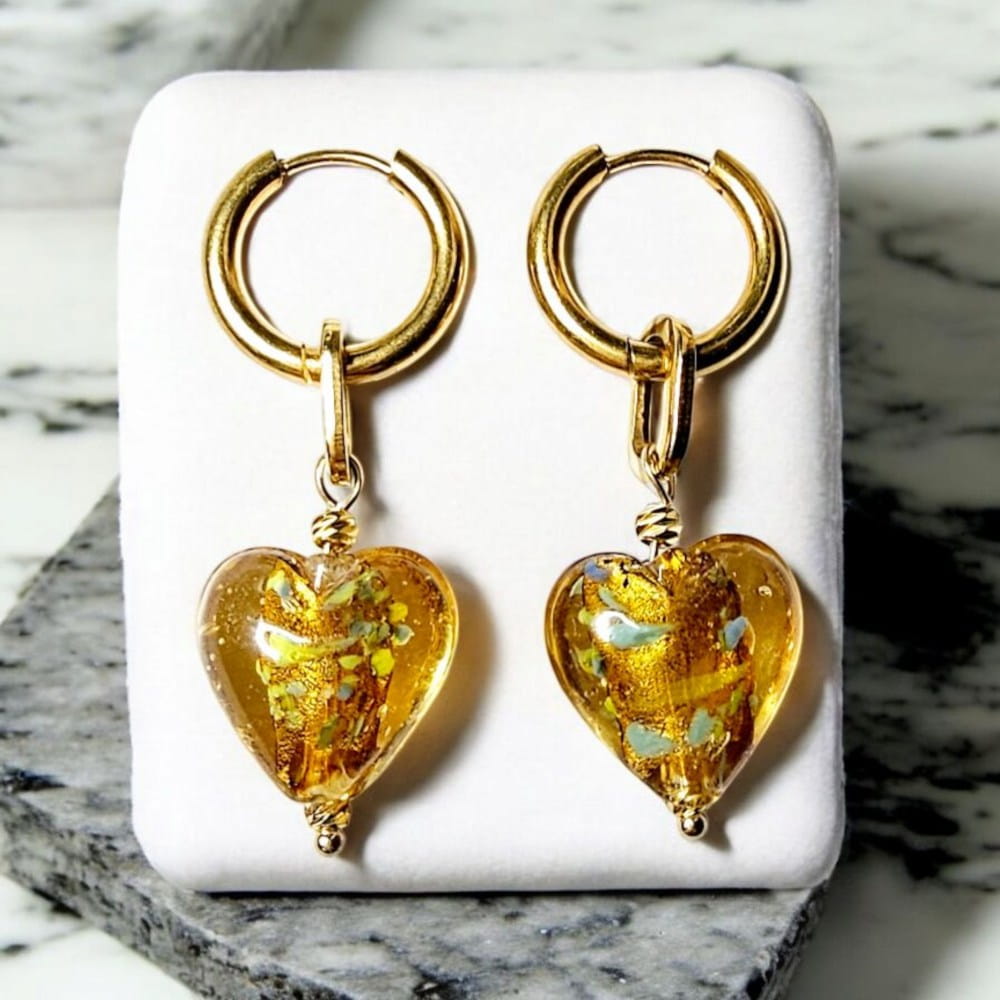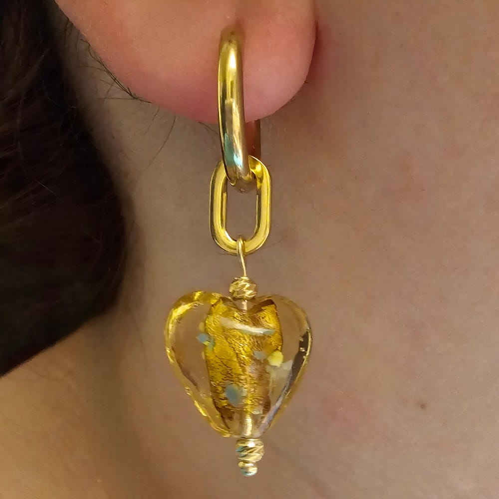 - Zawieszka: Szkło artystyczne serce w kolorze złota, możliwość ściągnięcia zawieszki i noszenia kolczyków kółek samodzielnie