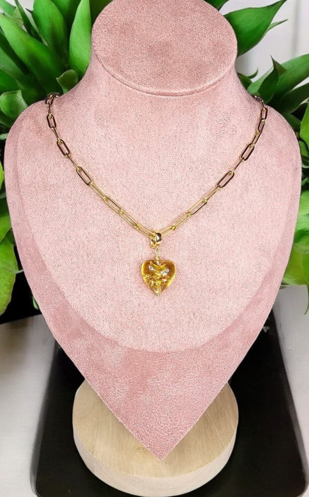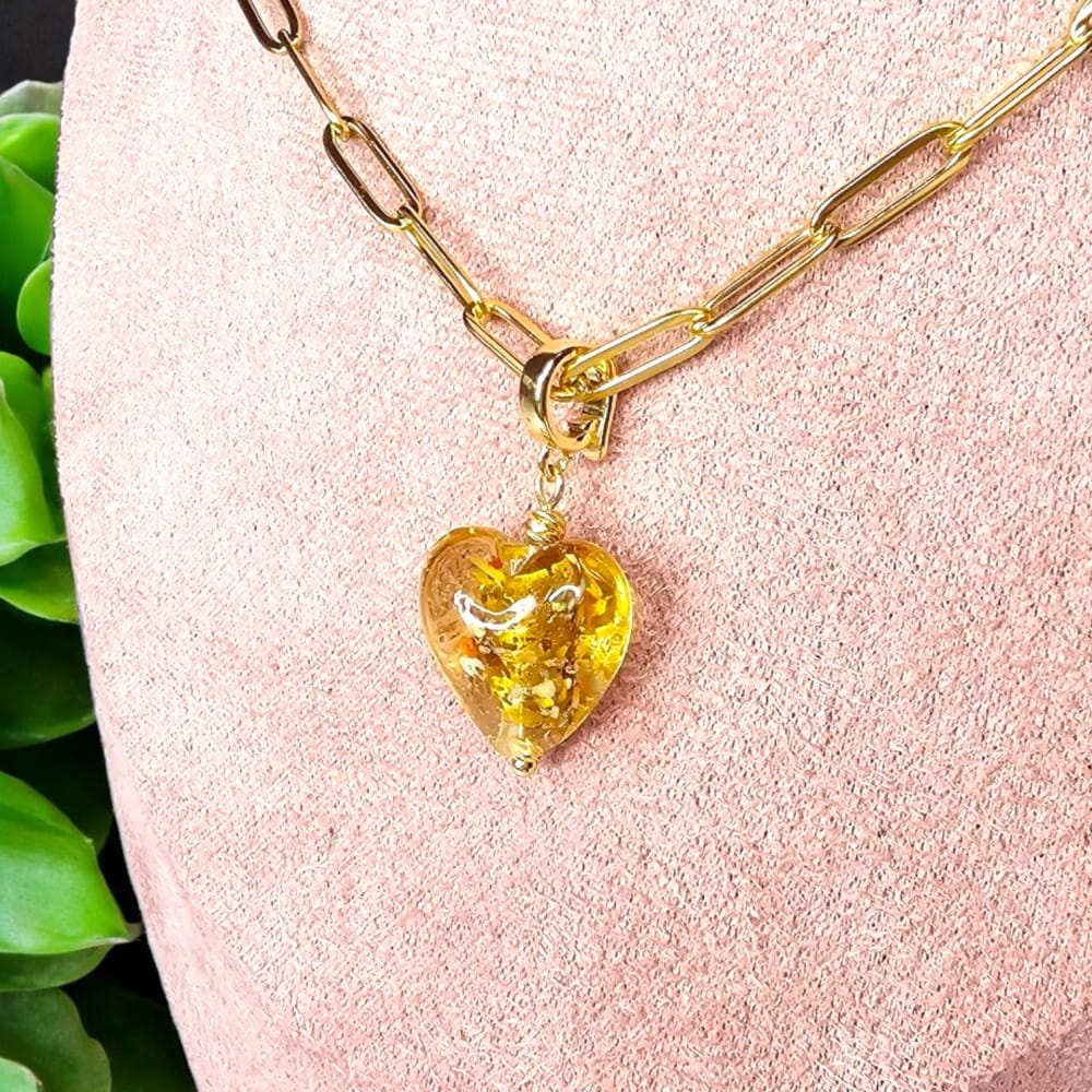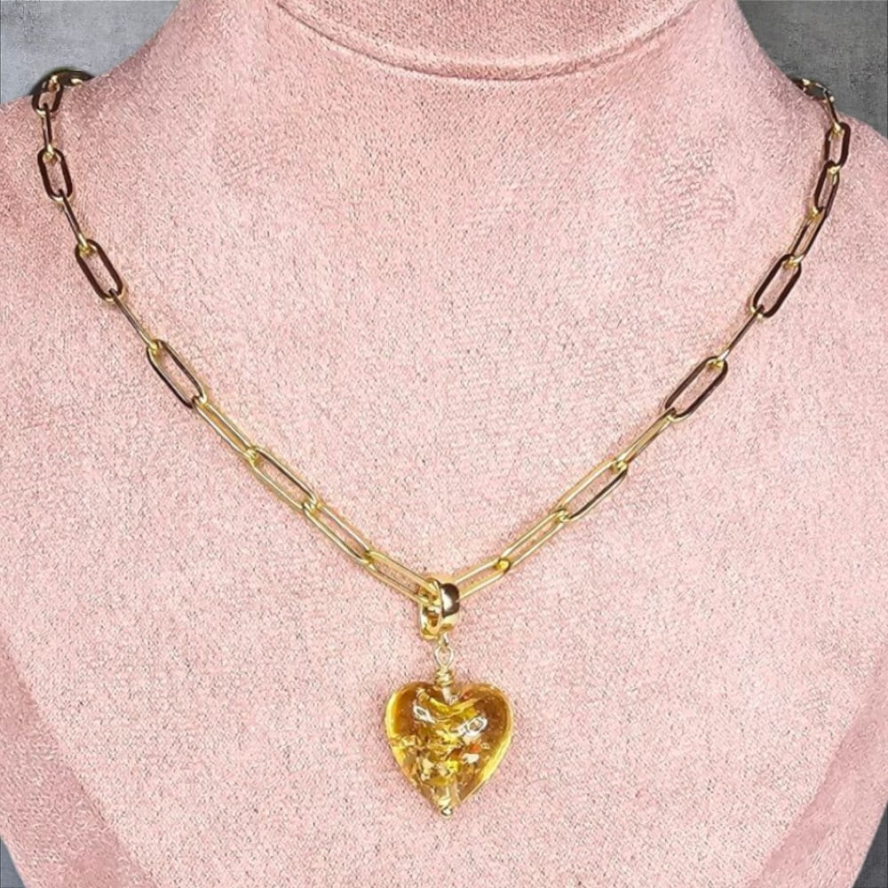 Pozłacany naszyjnik z zawieszką w kształcie Serca ze szkła artystycznego to elegancki dodatek, który doda blasku każdej stylizacji. Wykonany ze stali nierdzewnej, dostępny jest w wersji z 18-karatowym złoceniem, co zapewnia stylowy wygląd. Odpinana zawieszka umożliwia dowolne personalizowanie naszyjnika, czyniąc go idealnym prezentem na różne okazje. Ten wyjątkowy naszyjnik stanie się nieodłączną częścią Twojej kolekcji biżuterii, podkreślając Twój wyjątkowy gust. Możliwość wyboru innej zawieszki lub dobrania kolejnych na zmianę. Dzięki możliwości zmiany zawieszek uzyskujesz wiele efektów na jednym naszyjniku.
