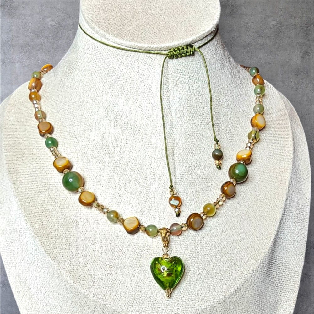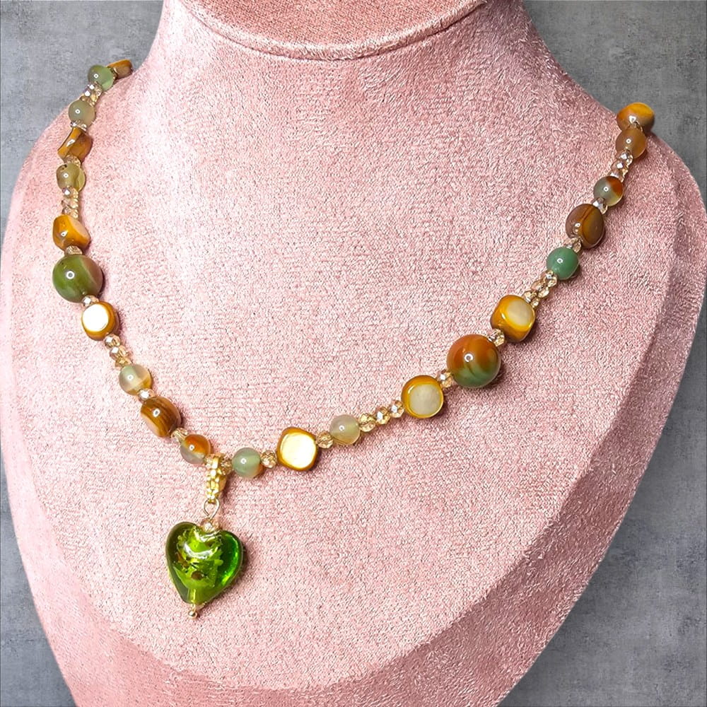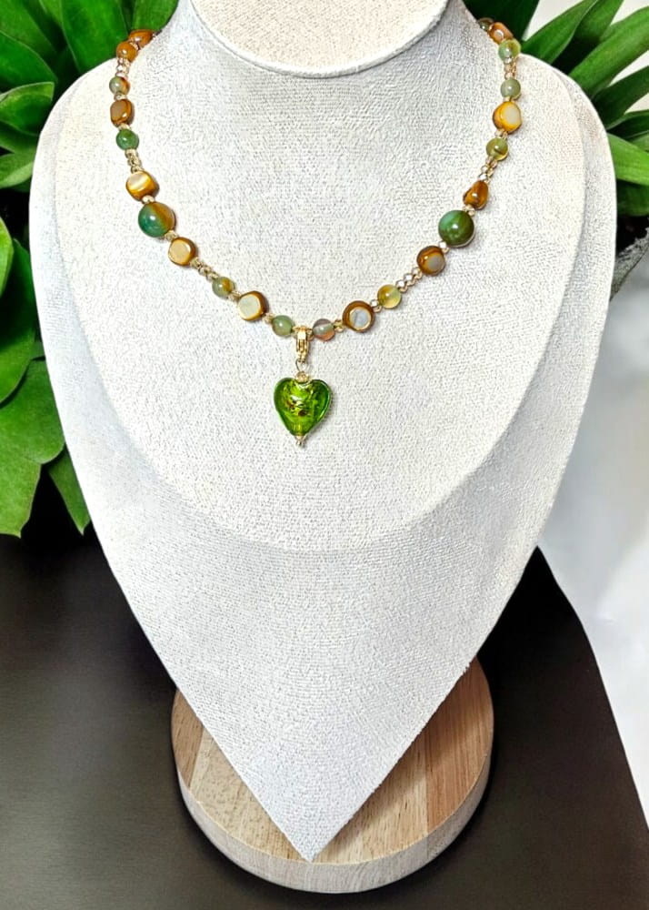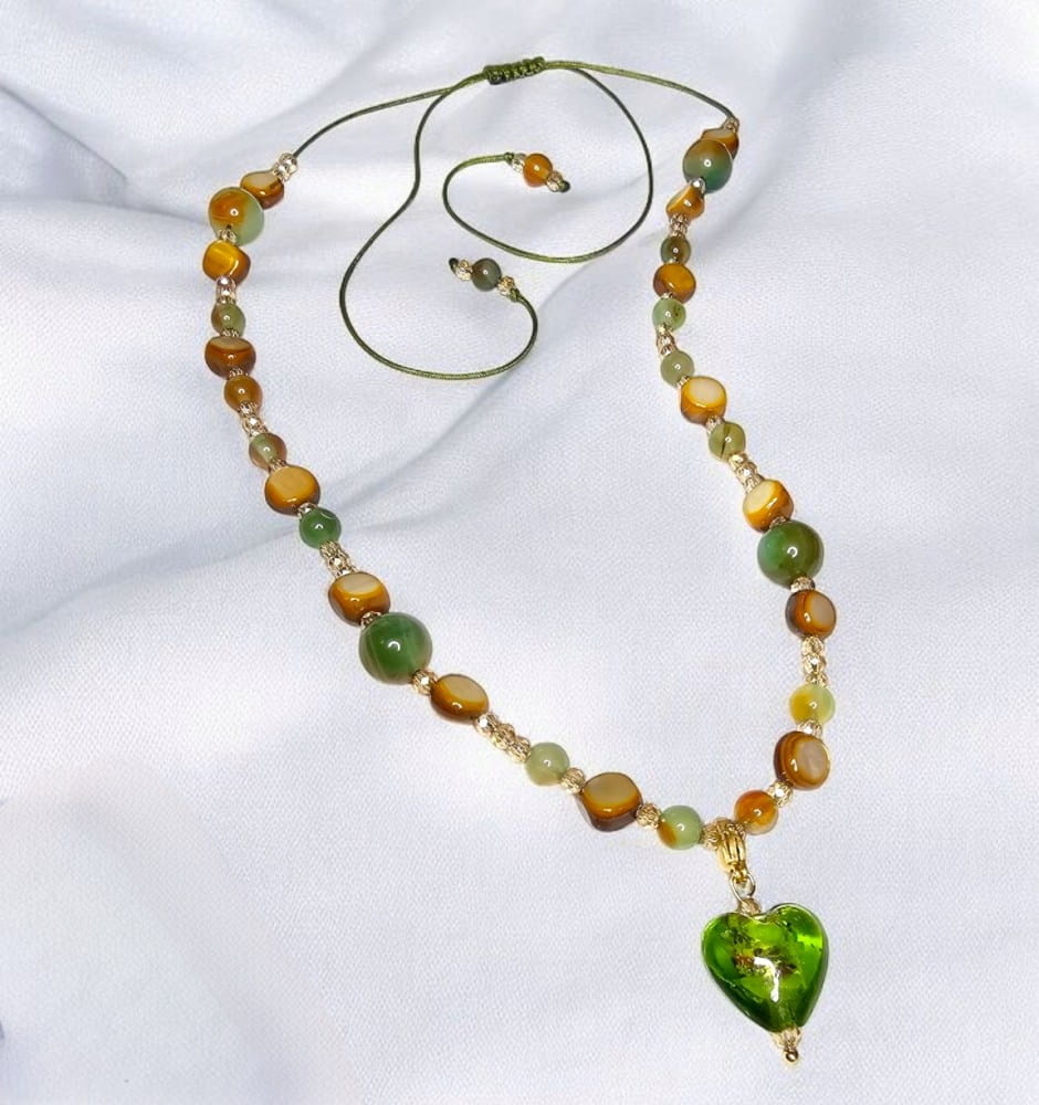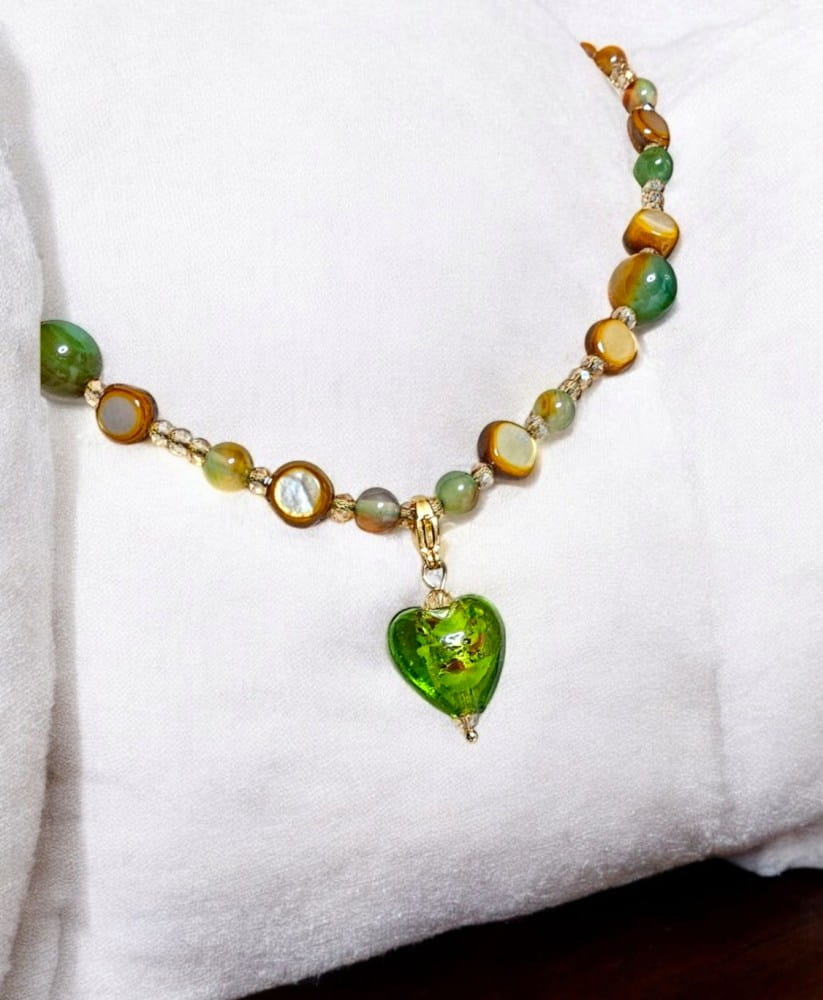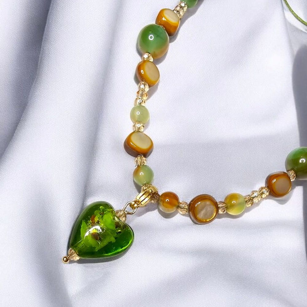 - Materiały: zawieszka w kształcie mieniącego się serca ze szkła artystycznego (każda zawieszka jest delikatnie inna, ponieważ jest to wyrób ręcznie robiony), przekładki szkło artystyczne w kolorze zieleni, sznurek jubilerski lub żyłka jubilerska. Zawieszkę możemy wykonać w formie wpiętej w naszyjnik na stałe lub odpinanej do wyboru. Zapięcie zawieszki i karabińczyk stal nierdzewna w kolorze srebra lub pozłacana 18k.