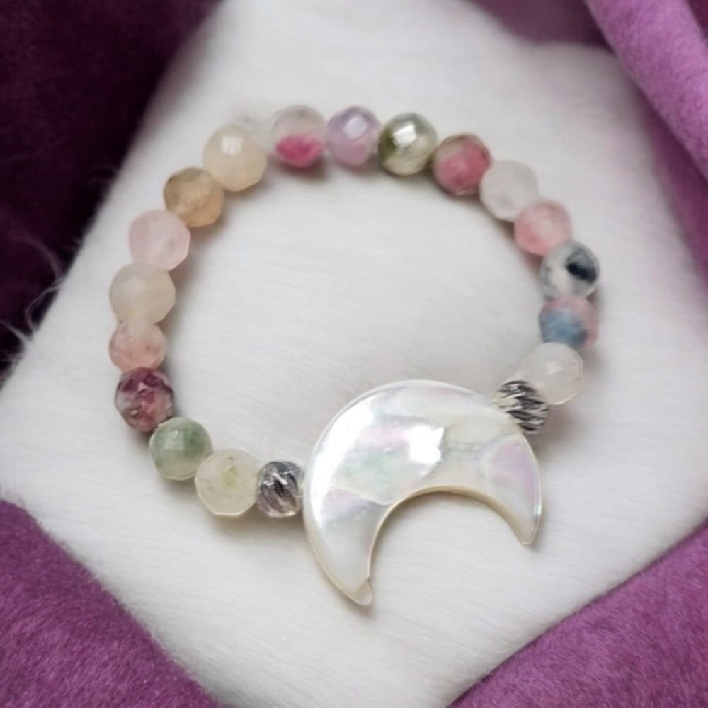 Pierścionek z kolorowych turmalinów i księżycem z muszli