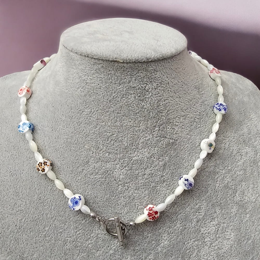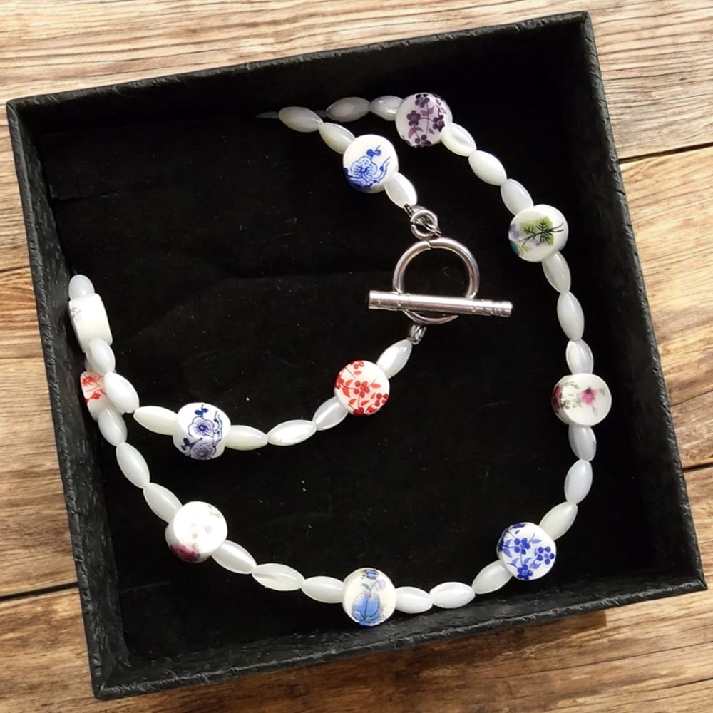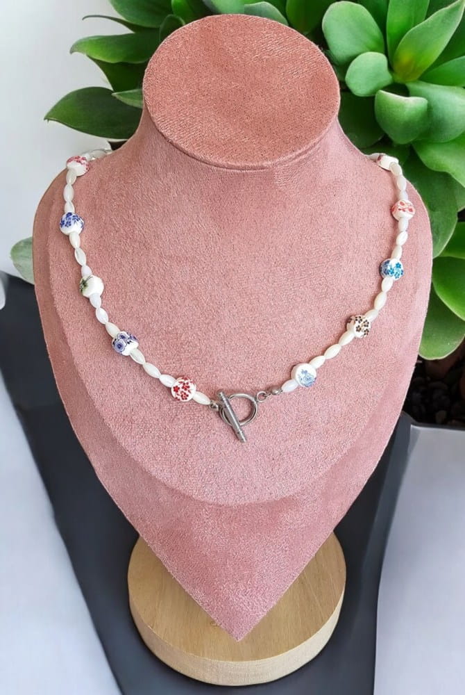 Elegancki i stylowy naszyjnik wykonany z ceramicznych koralików oraz koralików z masy perłowej to doskonałe połączenie klasyki z nowoczesnym designem. Subtelny połysk masy perłowej dodaje biżuterii lekkości i elegancji, a ceramiczne elementy nadają jej unikalnego charakteru. Dostępny z wygodnym zapięciem typu toggle lub tradycyjnym karabińczykiem – wybierz idealną wersję dla siebie!