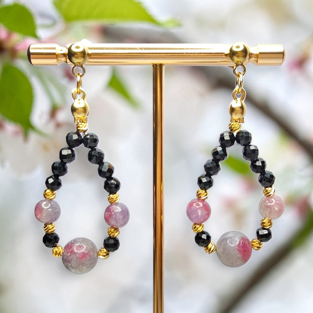 - Kamienie naturalne: turmalin różowy 6mm, 8mm, turmalin czarny 4mm fasetowany, przekładki stal nierdzewna.