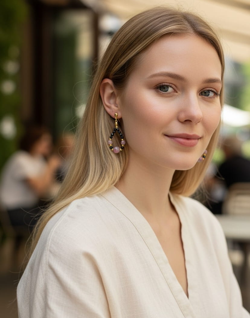 Kolczyki z kolekcji Wojowniczka to subtelna biżuteria o mocnym znaczeniu. Czarny turmalin wspiera ochronę energetyczną i uziemienie, a różowy turmalin pomaga wrócić do siebie i wzmocnić miłość własną. To połączenie idealne dla osób, które chcą czuć się spokojniej, stabilniej i bardziej pewnie każdego dnia. Biżuteria, która wygląda delikatnie, ale niesie w sobie siłę.